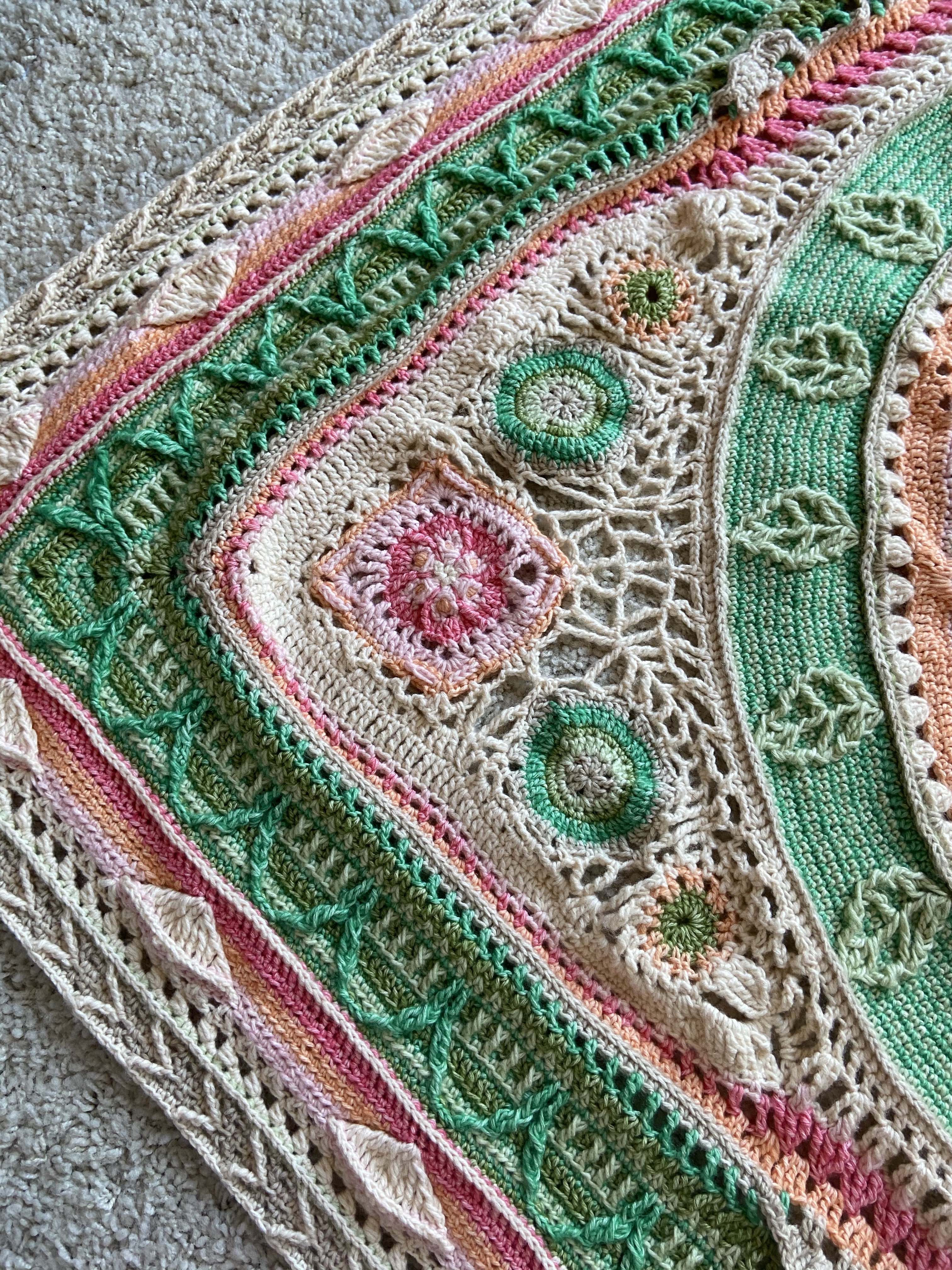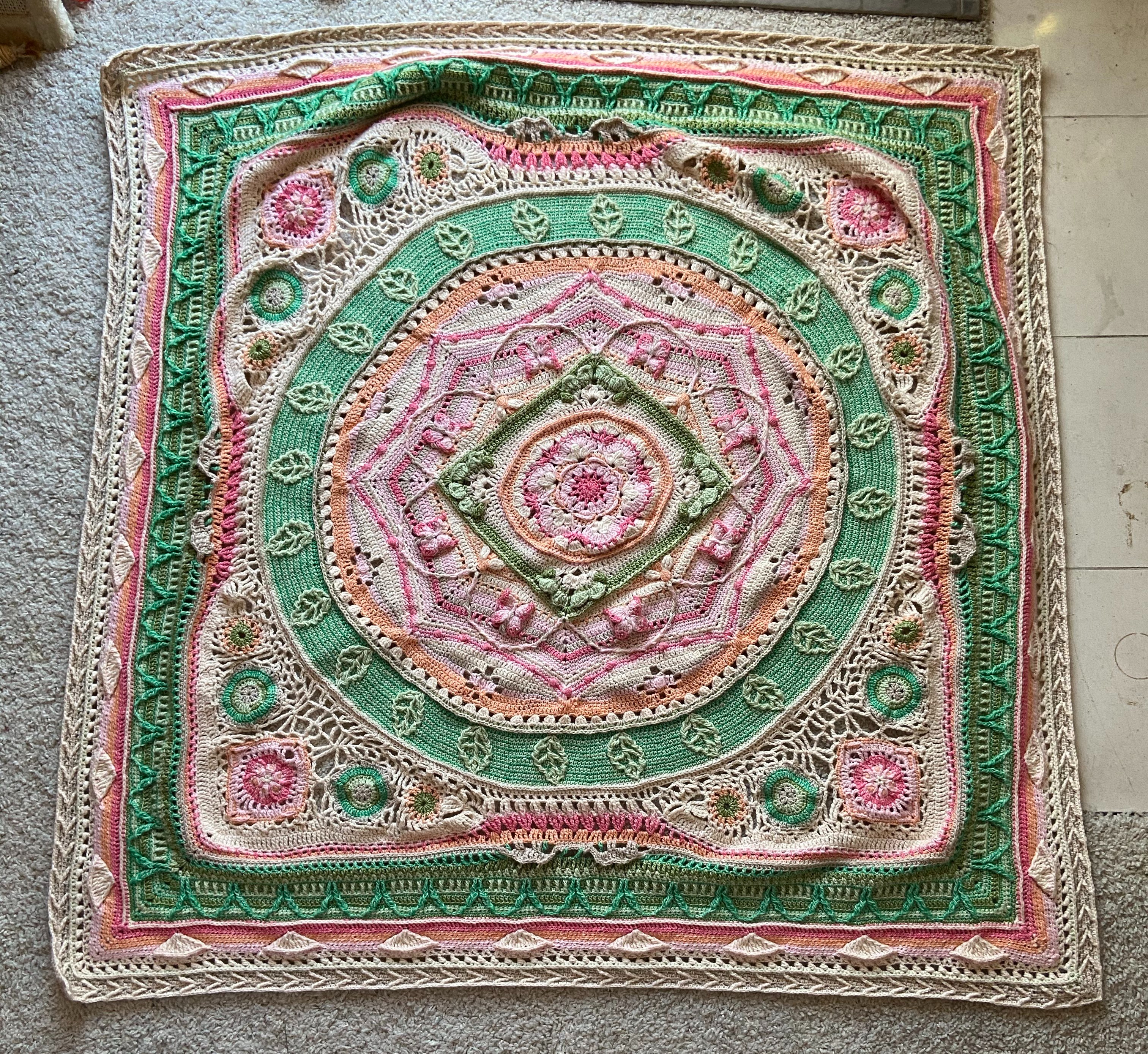 The very center represents a botanical garden, surrounded by a hedge maze. This is followed by the Entomology section with bees and butterflies. I’ve been knitting since I was 13-years-old, and always felt like crocheting was more difficult. I was amazed at the versatility of shapes that can be made in crochet. The center medallion of this blanket starts as a circle, morphs into a square, then to an octagon, all based on the varying heights of the stitches being made. Mind = blown.