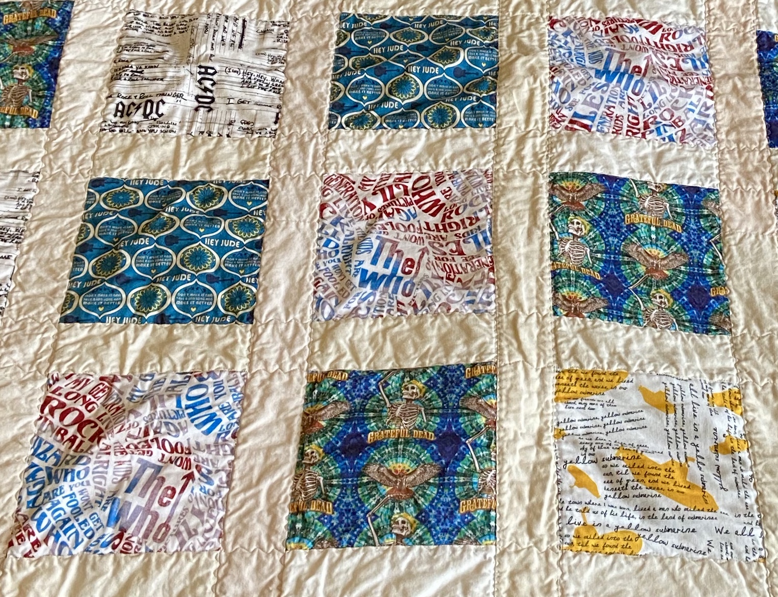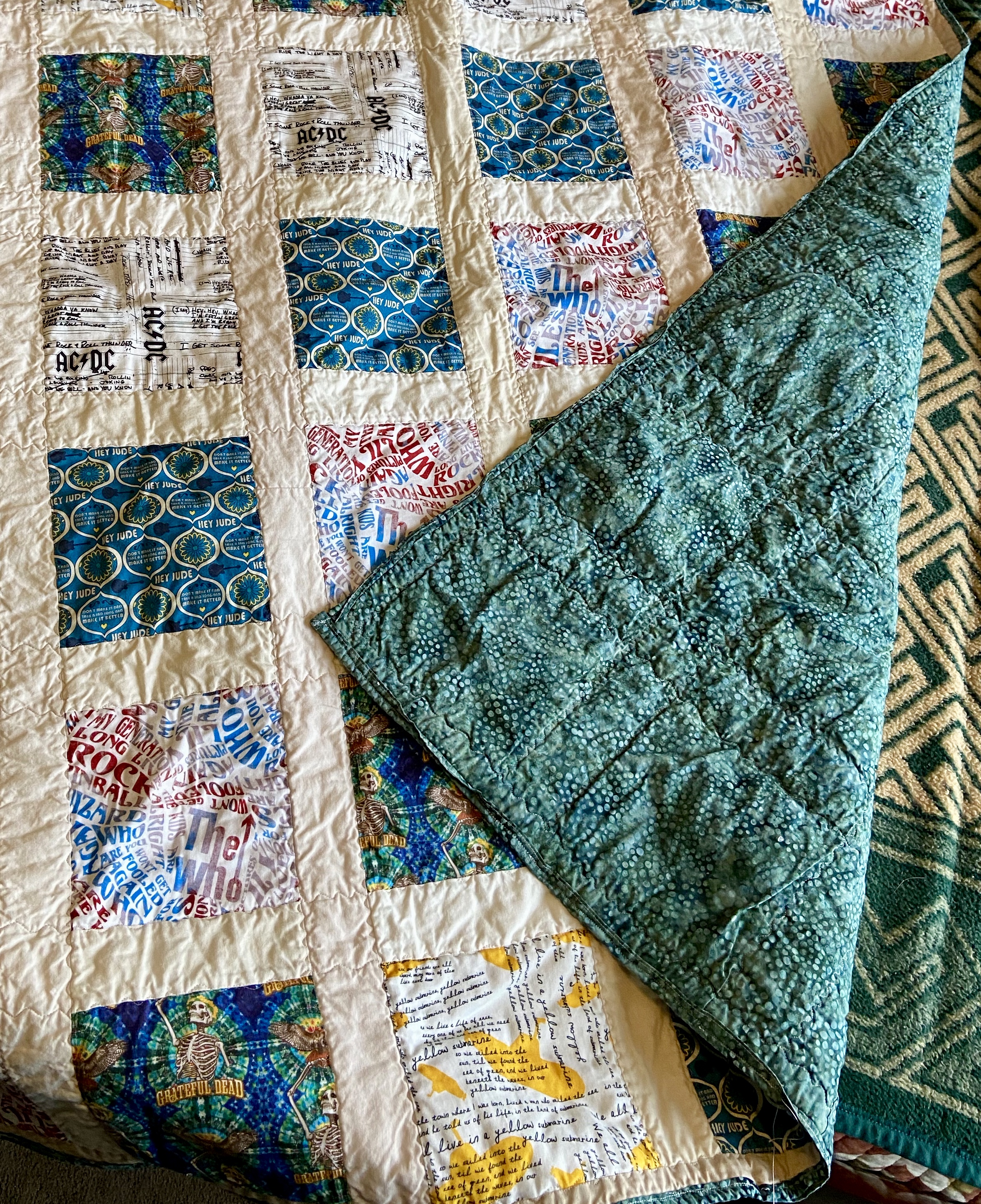 As I was finishing Mom’s ombre butterfly quilt, I decided to also make a quilt for my dad by December 23 when we left on our trip to Nevada for Christmas. Joann.com has a variety of licensed fabrics, and I was inspired by their classic rock band fabrics. Listening to Led Zeppelin, Queen, Fleetwood Mac, and Jim Croce with family on road trips is one of my fondest memories, especially when Dad shares stories about the concerts he went to in his pre-Bree days. Of the available band and color options, I went with blue and white fabrics printed with Grateful Dead, The Who, The Beatles, and AC/DC. To make the different prints pop, I wanted a neutral filler to go between the blocks. A fabric roll, or jelly roll, was perfect and cut down on the amount of measuring and cutting I would have to do since the strips are already trimmed to a 2.5 inch width. Hooray for working smarter not harder! I went with a dark green batik fabric for the backing and binding to compliment the colors on the quilt front. With that, the plan for Dad’s quilt was complete!